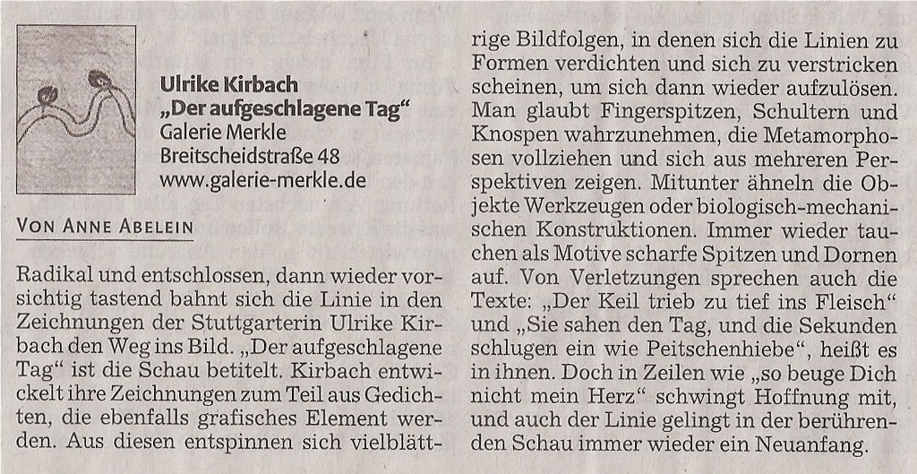 Ulrike Kirbach schildert in kleinformatigen Zeichnungen mit von Ausdruckskraft getragener Strichführung Situationen und Empfindungen menschlicher Existenz.