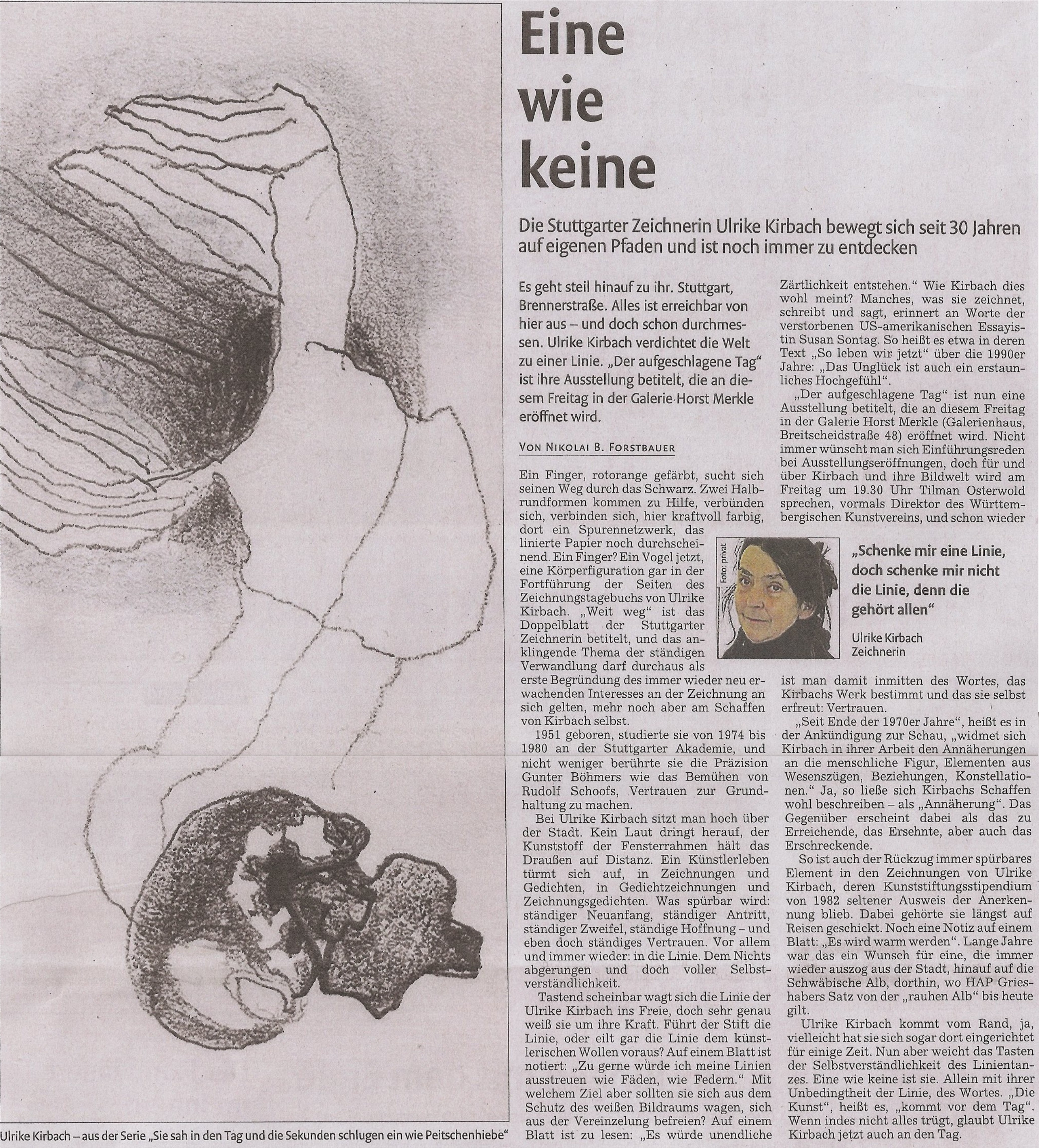 Seit Ende der siebziger Jahre, ihrer Studienzeit, widmet sie sich in ihrer Arbeit den Annäherungen an die menschliche Figur, Elementen aus Wesenszügen, Beziehungen, Konstellationen. Teils auf einfachem, liniertem Papier, teils auf zarten verletzlichen Bögen, gesondert oder in Folgen von Blättern im Charakter eines Tagebuches bezeugt Ulrike Kirbach differenzierte und übergreifende Aspekte und Dimensionen von Psyche und Physis, von Individuum wie von Sozialität.